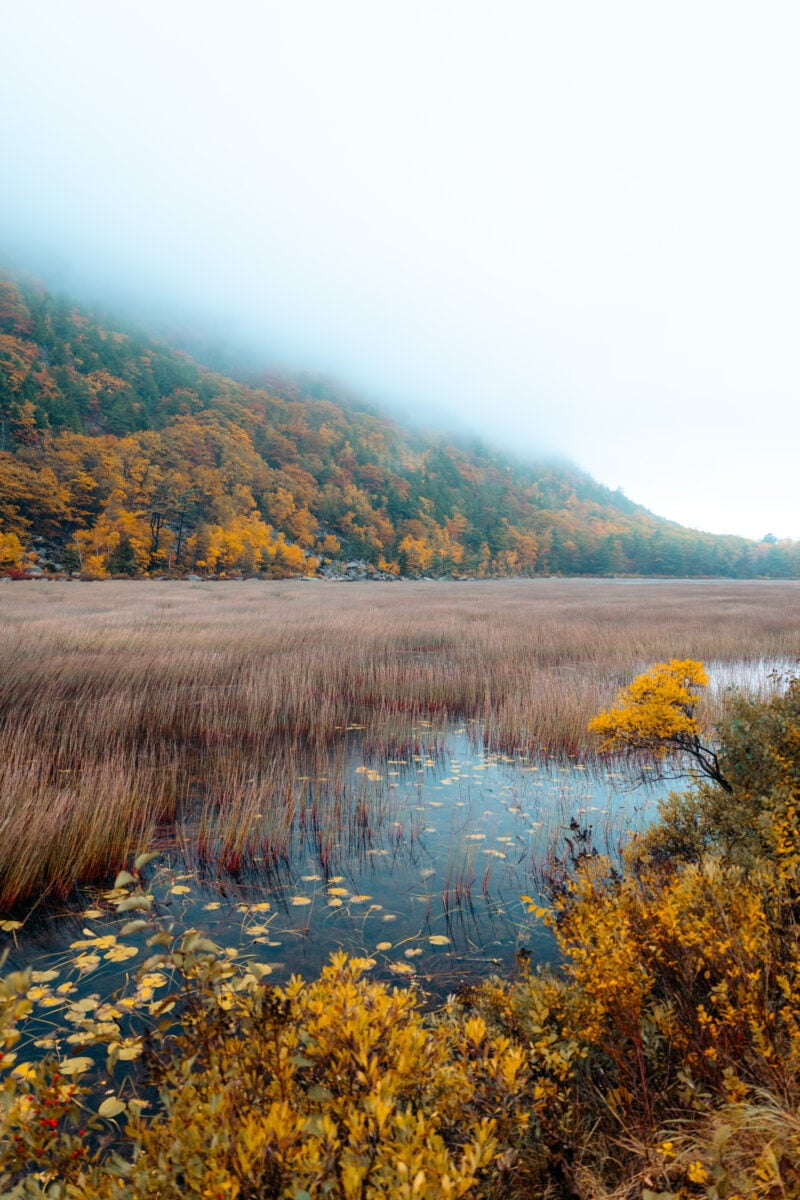 The Tarn is a small, underappreciated pond tucked between Mt. Dorr and Huguenot Head. It’s easy to drive past since it’s not as well-known as Jordan Pond or Eagle Lake, but it can be one of the most picturesque reflection spots in Acadia when the water is calm and the fall color is popping. There’s no formal parking area here, so you’ll typically pull off and stop on the shoulder, just make sure you’re completely out of the lane and not slowing traffic.